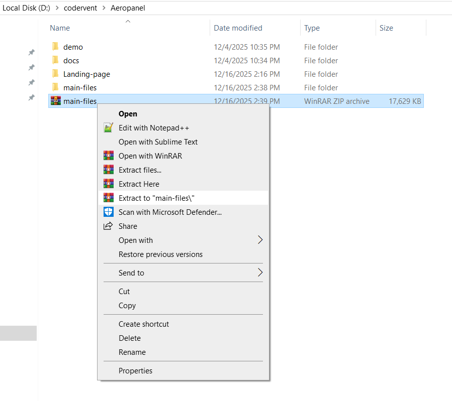 Download the AeroPanel package from Codervent and extract the ZIP file to your local machine.